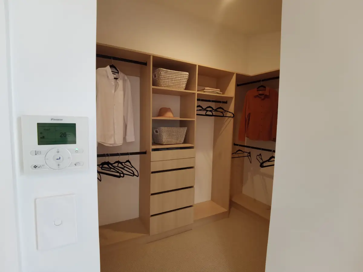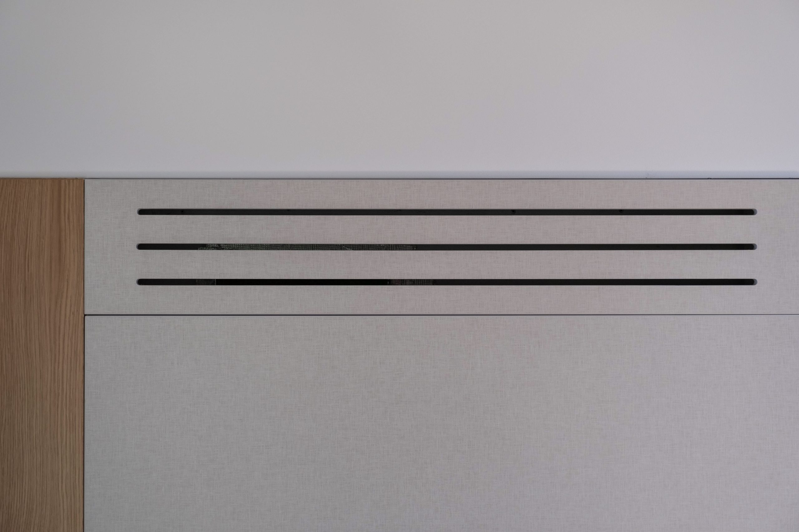 Our answer: the compact yet powerful Maico-Elicent REC 320 balanced ventilation unit paired with the sleek, space-saving Blaufast ducting system. Installed seamlessly in the main bedroom’s wardrobe and routed through the wardrobe top and narrow gaps between trusses, this tailored solution now silently ventilates all three bedrooms, maintaining a healthy indoor climate without disrupting the home’s clean, minimalist lines.